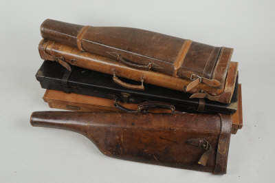 with compartment blocked for 25-inch barrels; together with a further leather gun case; and three leg-of-mutton cases