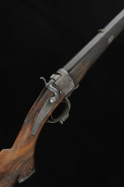ALEX HENRY A .360 PATENT FALLING BLOCK HAMMER RIFLE, NO. 2247 24-inch octagonal barrel, rear sight with folding leaves, the frame, non-rebounding backlock, bolted hammer and underlever with fine scroll engraving, 13-inch crudely made replacement stock with pistol grip and ribbed butt plate, 5lb., black powder proof S58 |