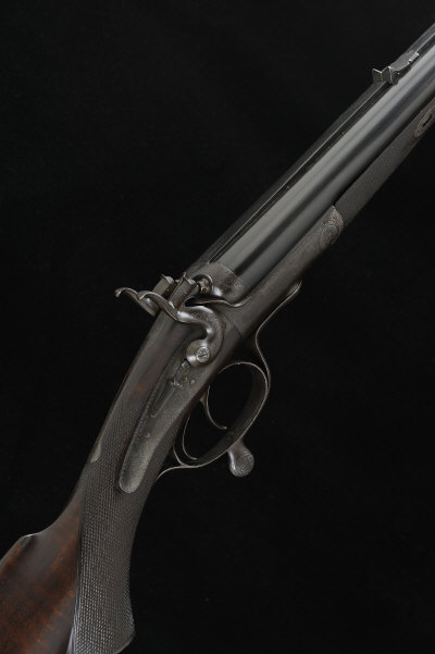E. & G. HIGHAM A .375 (2 1/2-INCH) HAMMER RIFLE, NO. 2940 26-inch sleeved barrels, the file-cut top surface with folding leaf sight, the rounded frame, rebounding back locks, bolted hammers and rotary underlever with scroll engraving, 14 1/2-inch figured stock with pistol grip, cheekpiece and steel butt plate, 9lb. 10oz., nitro proof S1 |
