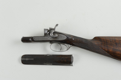 the bar-in-wood frame, rebounding bar locks, hammers and patent side lever with fine scroll engraving and retaining traces of original hardening colour, 14 1/2-inch well figured stock with engraved steel butt plate