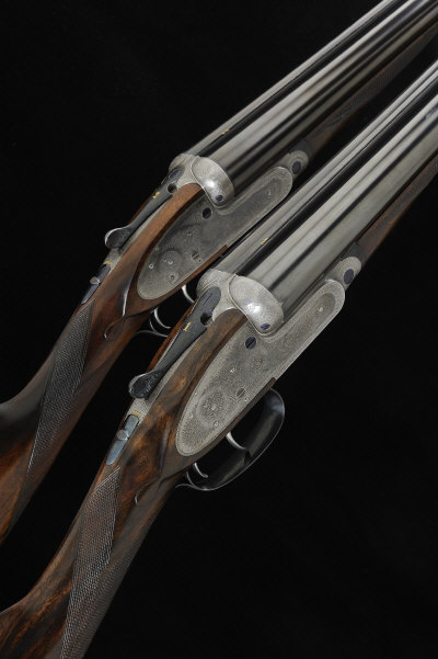 J. PURDEY & SONS A MATCHED PAIR OF 12-BORE SELF-OPENING SIDELOCK EJECTOR GUNS, NOS. 23208/23881 29-inch chopper-lump Whitworth steel barrels with 2 1/2-inch chambers, about improved cylinder and 1/4 choke borings, the frames, locks and gold numbered top levers with bouquet and scroll engraving and retaining traces of original hardening colour, 15 1/2-inch well figured stocks, slightly cast on for the left shoulder, No.2 including 1 1/4-inch extension, 6lb. 8oz., nitro re-proof, in their maker's lightweight leather motor case S2 The maker confirms that the guns were built in 1926. |