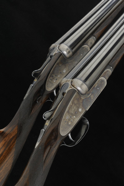 JOSEPH LANG & SON A PAIR OF 12-BORE SINGLE TRIGGER SIDELOCK EJECTOR GUNS, NOS. 15250/1 28-inch barrels with 2 1/2-inch chambers, about 3/8 and 1/2 choke borings, the re-coloured frames, locks and numbered top levers with scroll engraving and retaining much of their renewed hardening colour, 14 1/2-inch well figured stocks including rubber recoil pads, 6lb. 9oz., nitro proof, leather case with Joseph Lang & Son label S2 |