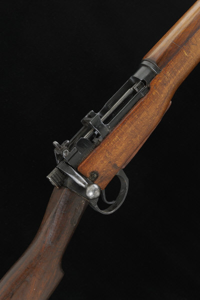 25 1/2-inch barrel with original fore sight, the receiver with folding battle sight, magazine well fitted with a wooden block, the sporterised half length stock with alloy butt plate, 13-inch pull, 7lb. 8oz., nitro proof