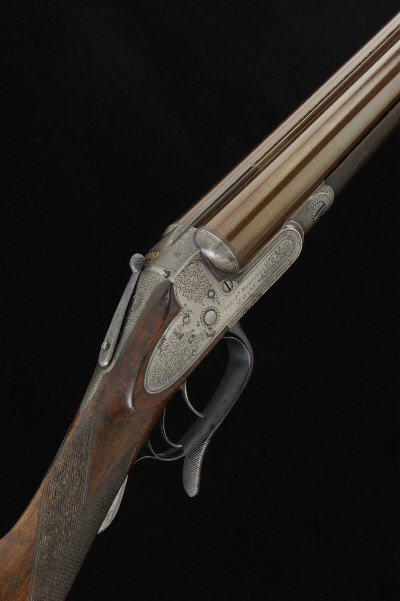T. MURCOTT A SCARCE 12-BORE MURCOTT PATENT "MOUSETRAP" SIDELOCK NON-EJECTOR GUN, NO. 2527 28-inch Parson's patent damascus chopper-lump barrels with 2 1/2-inch chambers, about true cylinder borings, the frame, locks and push-down underlever with scroll engraving and retaining traces of original finish, safety lever, grip safety, 14 1/4-inch figured stock, possibly a replacement, 6lb. 13oz., proof exemption certificate, bores severely pitted S2 The Murcott mousetrap patent 1003 of 1871 is regarded as the first commercially successful hammerless shotgun and was a significant turning point in the design of the modern shotgun. |