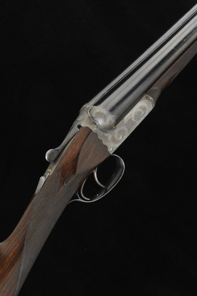 JOHN WILKES A 12-BORE LIGHTWEIGHT BOXLOCK EJECTOR GUN, NO. 14037 26 1/2-inch barrels with 2 1/2-inch chambers, about 1/2 and 3/4 choke borings, the scroll back frame and top lever with fine bouquet and scroll engraving and retaining some original hardening colour, the trigger guard engraved with a pheasant, 14 1/2-inch figured stock, 5lb. 15oz., nitro proof, in its maker's leather case S2 |
