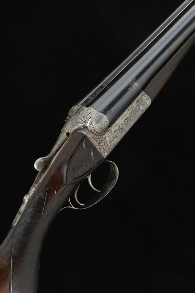 30-inch sleeved barrels with 2 3/4-inch chambers, about 1/2 and 3/4 choke borings, file-cut flat top rib engraved with a pigeon at the breech, crossbolt extension, the slightly rounded frame and top lever with foliate scroll engraving surrounding scenes of pheasant and duck in realistic landscapes, the heavy fences with side clips and carved with fern leaves, 14 3/8-inch highly figured stock with semi pistol grip including 3/8-inch extension, 7lb. 8oz., nitro proof, leather case