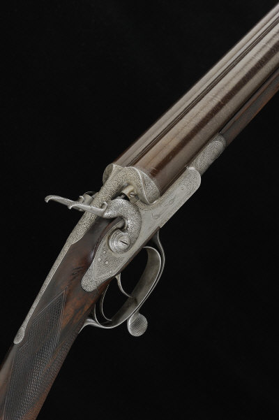 W. GRIFFITHS A 12-BORE HAMMER GUN, NO. 1891 29-inch damascus barrels with 2 1/2-inch chambers, about true cylinder borings, the frame, rebounding bar locks, hammers and rotary underlever with fine scroll engraving surrounding scenes of game, 14 1/4-inch figured stock with engraved heel and toe plates, 6lb. 8oz., black powder proof S2 |