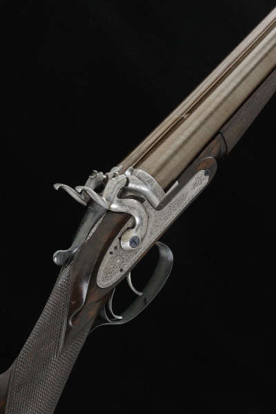 WESTLEY RICHARDS A 12-BORE BAR-IN-WOOD HAMMER GUN, NO. 2162 30 1/4-inch damascus barrels with 2 1/2-inch chambers, about 1/4 and 3/4 choke borings and numbered 18385, doll's head extension, the frame, patent top lever, rebounding bar locks and hammers with fine scroll engraving, 14 1/4-inch well figured stock with engraved skeleton heel plate, 6lb. 14oz., black powder re-proof, canvas case with reproduction maker's label S2 |