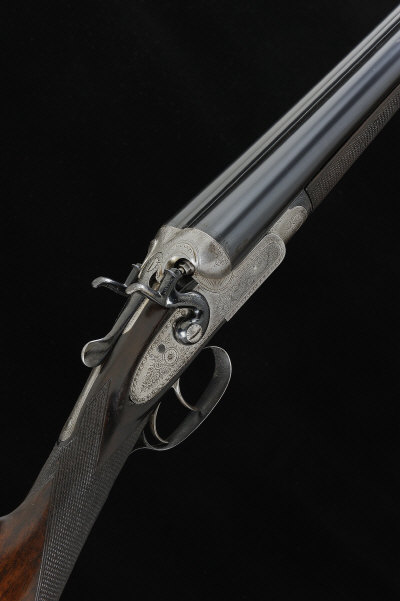 E. & G. HIGHAM A 12-BORE HAMMER GUN, NO. 4776 28-inch sleeved barrels with 2 3/4-inch chambers, about 3/8 and 5/8 choke borings, the frame, rebounding bar locks, hammers and top lever with scroll engraving, the maker's signed within a scrolling banner, 14 1/2-inch figured stock with ribbed butt plate, 6lb. 10oz., nitro proof, leather case with Cogswell & Harrison label S2 |