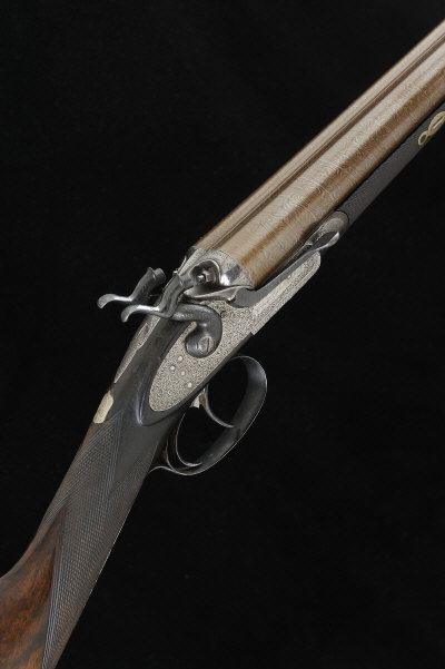 WILKINS A 12-BORE SIDE LEVER HAMMER GUN, NO VISIBLE NUMBER 29-inch damascus barrels with 2 1/2-inch chambers, about improved cylinder borings, the frame, non-rebounding backlocks, hammers and forward pointing side lever with scroll engraving, 14 1/2-inch figured stock with steel butt plate, 6lb. 10oz., nitro re-proof, left barrel wall thickness well below the recommended minimum, rejointing recommended, mahogany case with reproduction Thomas Jackson label S2 |