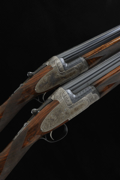 WESTLEY RICHARDS A SCARCE MATCHED PAIR OF 12-BORE SINGLE TRIGGER "OVUNDO" MODEL OVER AND UNDER EJECTOR GUNS, NOS. 18180/18459 28-inch barrels with 2 3/4-inch chambers, about 3/8 and 3/4 choke borings, solid concave top ribs and side extensions, the frames, side plates and patent top levers with bold acanthus scroll engraving and retaining much original hardening colour, patent selective single triggers, the side plates with hinged inspection ports, the hinged action base plates opening to reveal the lockwork, 14 1/2-inch highly figured replacement stocks, 6lb. 13oz., nitro proof, in their maker's canvas case S2 The maker confirms that the No.1 gun was completed in July 1928 and that the No.2 gun was completed in August 1935 to complete the pair. |