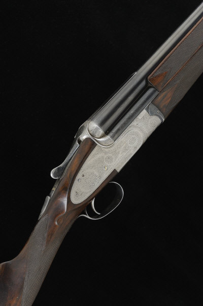 JOSEPH LANG & SON A 16-BORE SIDELOCK EJECTOR SINGLE TRIGGER OVER AND UNDER EJECTOR GUN, NO. 16513 27 7/8-inch barrels with 2 3/4-inch chambers, about 1/4 choke borings, the frame, backlocks and top lever with fine bouquet and scroll engraving, polished bright overall, 14-inch figured stock with ribbed butt plate, slightly cast-on for the left shoulder, 6lb. 7oz., nitro re-proof, bottom barrel slightly marked, re-jointing recommended, in its maker's brassbound oak and leather case S2 The gun incorporates the White & Dryden 1912 patent action and the maker confirms that the gun was built for Dr E. R. Campbell on the 20th November 1923. |