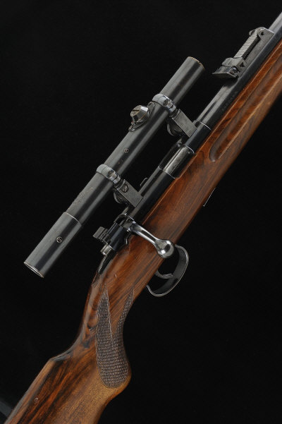 MAUSER A .22 BOLT-ACTION SPORTING RIFLE, NO. 121379 26 1/2-inch heavy barrel with ramp fore sight and tangent rear sight graduated to 200, the receiver mounted with a Zeiss Zielklein telescopic sight, bolt with flag safety, detachable box magazine, the half length figured stock with pistol grip and maker's butt plate, sling swivels, 8lb. 12oz., German nitro proof S1 |