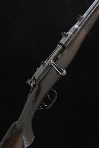 MANNLICHER SCHOENAUER A 6.5MM MODEL 1903 BOLT-ACTION STUTZEN RIFLE, NO. 26812 18 1/2-inch replacement barrel with ramp fore sight and folding leaf sight, the receiver previously fitted with scope mounts, bolt with flag safety, rotary magazine, double set triggers, the full length stock with pistol grip, cheekpiece and ribbed steel butt plate with trap, 6lb. 14oz., nitro proof S1 |