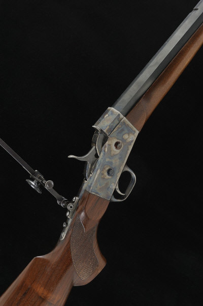 PEDERSOLI A .45-70 ROLLING BLOCK TARGET RIFLE, NO. R04365 30-inch octagonal barrel with tunnel fore sight, rear sight removed, the frame, rolling block and hammer retaining much original hardening colour, tang mounted aperture rear sight, 14 1/2-inch figured stock with pistol grip and steel butt plate, 10lb. 7oz., Italian nitro proof S1 |