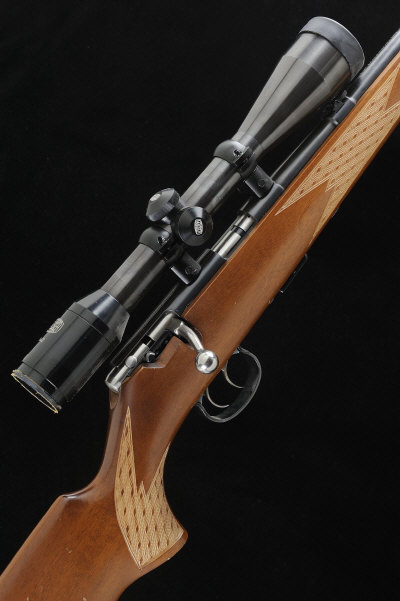 ANSCHUTZ A .22 MODEL 1418 BOLT-ACTION STUTZEN SPORTING RIFLE, NO. 3007536 19 1/2-inch barrel with ramp fore sight and folding rear sight, the receiver mounted with a Mauser 6x42 telescopic sight, bolt with side safety, detachable box magazine, double set triggers, the full length figured stock with pistol grip, cheekpiece and ribbed butt plate, 14 1/2-inch pull, sling swivels, 6lb. 12oz., German nitro proof S1 |