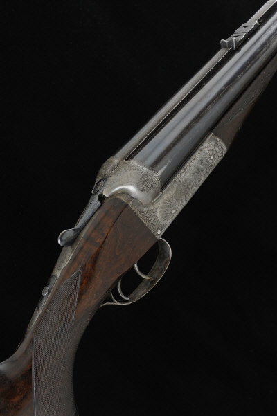 JOHN WILKES A RARE .600 NITRO EXPRESS BOXLOCK EJECTOR RIFLE, NO. 8084 26-inch chopper-lump barrels with ramp fore sight with folding moon bead, the stippled short raised rib with folding platinum lined leaf sights to 300, doll's head extension, the bottom rib engraved ".600 3-inch case cordite 110grs. bullet 900grs", the frame and top lever with fine scroll engraving around scenes of elephant and tiger in realistic landscapes, retaining some original hardening colour, fences with side clips, disc set strikers, 14 1/2-inch well figured stock with pistol grip and rubber recoil pad, pad perished, sling eyes, 15lb. 4oz., nitro proof, in its original brassbound oak and leather case with C. B. Vaughan retailer's label S1 The maker confirms that the rifle was completed on the 20th April 1914 and that it was sold to C. B. Vaughan two days later. The rifle appears unaltered from its original specification. John Wilkes built nine rifles in total in this calibre under their own name and they were all sold by C. B. Vaughan apart from the very first. The final three rifles were completed in 1922. |