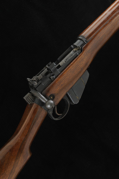 25 1/2-inch barrel with ramp fore sight, the receiver with folding aperture rear sight to 100, detachable box magazine with .22 insert, full length stock with hand guards and brass butt plate, 13-inch pull, 9lb. 1oz., nitro proof
