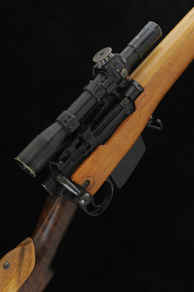 BSA A 7.62MM L42 A1 BOLT-ACTION SNIPER RIFLE, NO. G33057 27 1/2-inch heavy barrel with raised fore sight, the receiver mounted with its correct L1 A1 telescopic sight (with No.32 Mk 3 markings lined out) and dated '1945, in its numbered mount, the M47C butt socket dated '1944', the side wall with D71 date, detachable box magazine, the half length stock with hand guard, cheekpiece and brass butt plate, 13 1/4-inch pull, 12lb. 4oz., nitro proof, in its transit chest with scope tin, etc S1 |