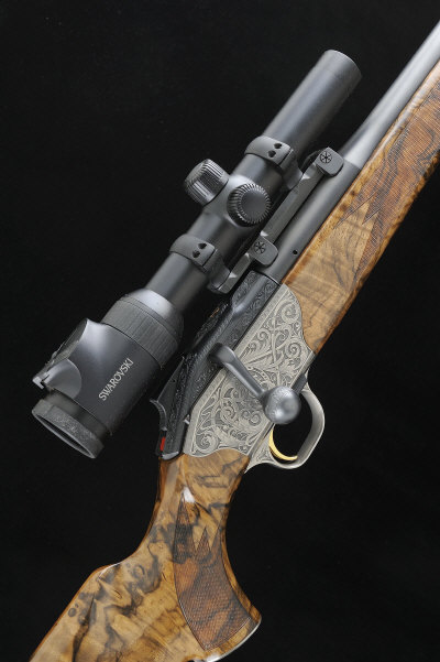 22 1/2-inch barrel with ramp fore sight and fixed rear sight, mounted with a Swarovski Z6i 1-6x24 telescopic sight, in quick detachable mounts, the bolt and receiver profusely engraved with foliate scrollwork, the trigger block numbered in gold '2', the guard with the initials 'GJB', 14 1/2-inch highly figured stock with pistol grip, cheekpiece and rubber recoil pad, 14lb. 2oz., German nitro proof