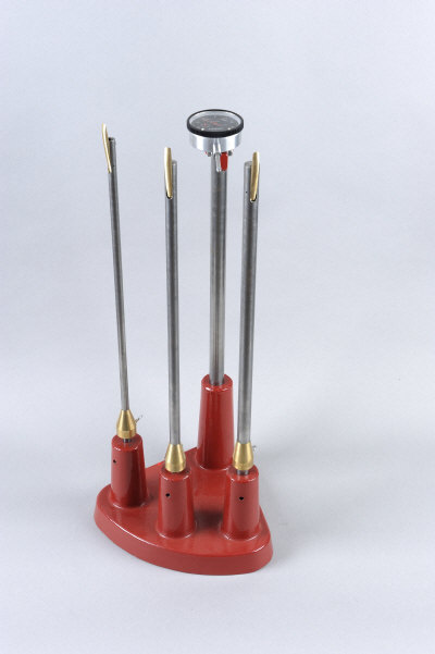 A BARREL WALL THICKNESS GAUGE the red painted base with three barrel stands to measure 10-bore down to 28-bore, new and unused