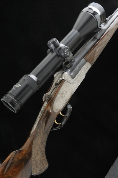 CH. PRAMESBERGER A 7X65MM SINGLE BARREL SIDELOCK EJECTOR KIPLAUF RIFLE, NO. 24127 25 1/2-inch octagonal barrel with machined top surface and ramp fore sight, fixed rear sight and mounted with a Zeiss Diavari VM 2.5-10x50 telescopic sight in quick detachable mounts, crossbolt extension, the frame, locks and pierced top lever with fine scroll engraving, gold washed double set triggers and lockwork, the trigger guard inlaid in gold with the initials 'JB', 14 1/2-inch well figured stock with pistol grip, cheekpiece and chequered butt plate, sling swivels, 8lb. 8oz., Austrian nitro proof S1 † Please note that VAT @ 20% is payable on the hammer price. |