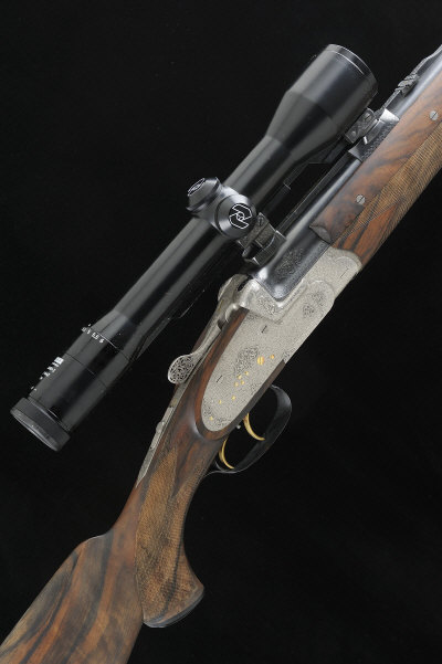 25 1/2-inch barrels with full length machined rib, folding leaf sight and mounted with a Zeiss Diavari Z 1.5-6x42 telescopic sight, the smoothbore barrel with 3-inch chamber, about full choke boring, the frame, locks and pierced top lever with fine scroll engraving, crossbolt extension, gold washed triggers and lockwork, the trigger guard inlaid with the gold intials 'JB', 14 3/4-inch highly figured stock with pistol grip, cheekpiece and maker's butt plate, sling swivels, 8lb. 10oz., Austrian nitro proof, in its maker's leather case