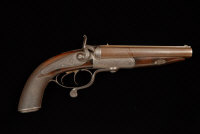 W. THORN A .577 HOWDAH PISTOL, NO. 126 7-inch Damascus barrels, the rounded frame, non re-bounding backlocks, hammers and rotary under lever with scroll engraving, in its leather case |