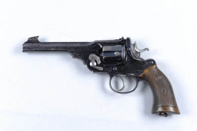 WEBLEY A .455/.476 WG ARMY MODEL REVOLVER, NO. 8792 the hinged barrel with P. Webley & Son retailer's stamp, fitted with later adjustable target sights, the frame with stirrup catch and retaining much original finish, flared walnut grip, lanyard loop, black powder proof