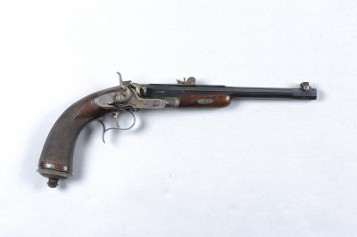 J. KASTLI A FINE 9MM SINGLE SHOT HAMMER SALOON PISTOL 10-inch fluted octagonal barrel with adjustable fore sight, the rear sight sliding by gold graduated bed, the frame, rebounding bar lock, hammer and side lever with fine scroll engraving and retaining virtually all of its original hardening colour, chequered walnut grip with engraved pommel, Belgian black powder proof