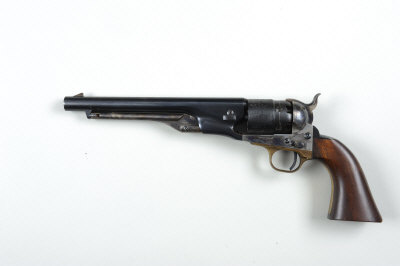 UBERTI A .44 PERCUSSION REVOLVER, NO. 100955 8-inch barrel with loading lever, the stepped cylinder with rolled naval scene, the frame and hammer retaining much original hardening colour, smooth walnut grips, Italian black powder proof, in its case with flask, etc S1 |