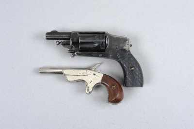 A BELGIAN 5.5MM "VELO DOG" TYPE DOUBLE ACTION REVOLVER 1 3/4-inch octagonal barrel, solid frame with six-shot cylinder, folding spur trigger, chequered composition grips; together with a Belgian 7mm rimfire derringer, no. 14500, 2 3/4-inch barrel, the frame with spur trigger, smooth walnut grips, retaining some of its nickel-plated finish overall (2) |