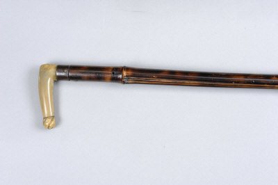 A MUZZLE LOADING PERCUSSION WALKING STICK GUN 29-inch barrel of approximately .410 bore, with folding ramrod incorporated in to the muzzle plug, the cane covered body with handle unscrewing to reveal the percussion metal, worn overall |