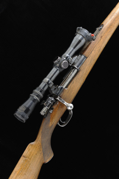 MAUSER A 7X57MM BOLT-ACTION SPORTING RIFLE, NO. 108084 23 1/2-inch barrel with ramp fore sight and tangent rear sight, the receiver mounted with a Pecar telescopic sight in quick detachable mounts, bolt with flag and side safeties, magazine with hinged base plate, the three quarter length stock with hand guard, pistol grip, cheekpiece and rubber recoil pad, 9lb. 6oz., German nitro proof S1 |