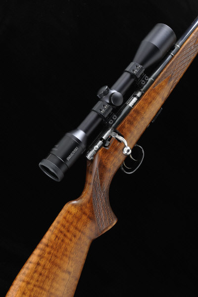 ANSCHUTZ A .22 MODEL 1418 STUTZEN BOLT-ACTION SPORTING RIFLE, NO. 1304102 19 1/2-inch barrel with ramp fore sight, the rear sight removed, the receiver mounted with a Swarovski 6x42 telescopic sight, bolt with side safety and detachable magazine, double set triggers, the full length stock with pistol grip, cheekpiece and ribbed butt plate, 14 1/2-inch pull, 6lb. 12oz., German nitro proof S1 |
