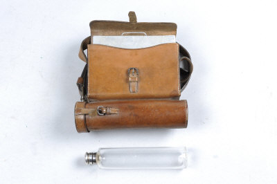 A LEATHER STALKING SET the leather case with sandwich box and glass flask, with shoulder strap and belt loops, impressed "Orpwood, Royal Saddlers, Oxford" |