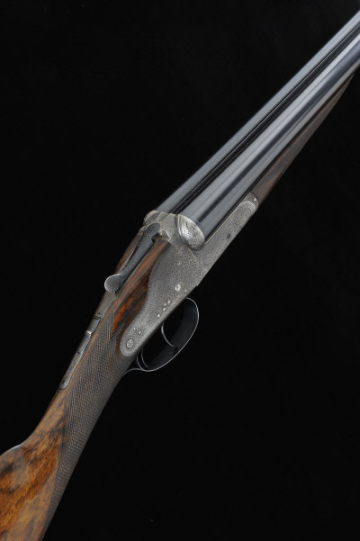 CHARLES LANCASTER A 12-BORE BACKLOCK EJECTOR GUN, NO. 13395 28-inch sleeved barrels with 2 1/2-inch chambers, about improved cylinder and 1/2 choke borings, the frame, backlocks and top lever with fine scroll engraving and retaining some original hardening colour, the maker's name signed within a scrolling banner, 15 1/4-inch highly figured stock including 3/4-inch extension, 6lb. 11oz., nitro proof, leather case S2 The gun was sleeved to the highest standard in 1988. |