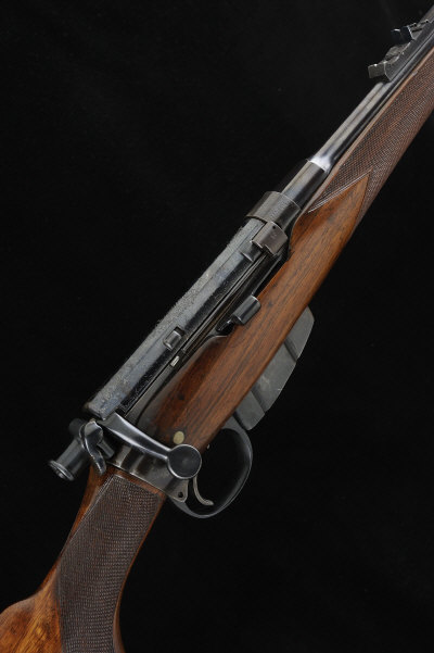 25 1/4-inch barrel with ramp fore sight and folding leaf sight, ladder sight missing, bolt with engraved dust cover, safety to cocking piece, bolt with turned out handle, the receiver with magazine cut-off, the half length stock with pistol grip and ribbed butt plate, 14-inch pull, sling eyes, 6lb. 12oz., nitro proof