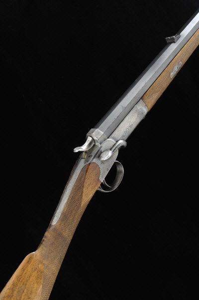 A .300 HAMMER ROOK RIFLE, NO. 10114, OF HOLLAND & HOLLAND PATTERN 26-inch octagonal barrel with folding leaf sight to 150, the frame with central hammer and side lever, with scroll engraving and retaining faint traces of hardening colour, 14 3/4-inch figured straight hand stock with steel butt plate, 5lb. 8oz., special definitive proof S58 The rifle appears to be an example of Holland & Holland's celebrated "Five Guinea Rifle". Although the barrel top surface is not signed, the serial number is in the correct range and the barrel underside is stamped with the HJH mark that is usually found on these rifles, as illustrated on page 81 in Colin Greenwood's book on the subject. |