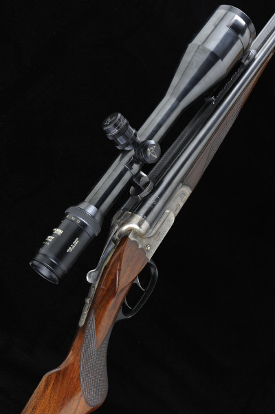 B.S.W., SUHL A GERMAN .318 ACCELERATED EXPRESS BOXLOCK EJECTOR RIFLE, NO. 38247 26-inch barrels with machined rib and raised fore sight, rear sight with folding leaves and mounted with a Swarovski Habicht 3-12x56 telescopic sight in quick detachable claw mounts, crossbolt extension, the bolstered scroll-back frame with scroll decoration and retaining some original hardening colour, horn trigger guard and set front trigger, 13 3/4-inch figured stock with pistol grip, cheekpiece and rubber recoil pad, sling swivels, 10lb. 6oz., German nitro proof and subsequent Austrian re-proof, the barrel flats with date for Feburary 1938 S1 |