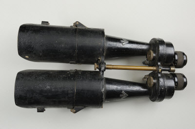 ROSS A LARGE PAIR OF PATT. 12114 NAVAL BRIDGE BINOCULARS, NO. 121999 the black painted body with broad arrow emblems and stamps and dated '1942', folding spray shields |
