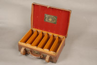 HARRODS LTD. A BRASS BOUND OAK AND LEATHER CARTRIDGE MAGAZINE for about 500 cases, compartment leather straps and oak dividers |