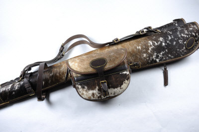 A PAIR OF NORMANDY HIDE AND LEATHER GUNSLIPS AND MATCHING CARTRIDGE BAG with leatther straps, the bag for about 150 cartridges |