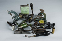 A COLLECTION OF GUNMAKERS ACCESSORIES including: 4 rolled turnover machines, 2 pairs of locks, powder and shot measures, nipple key, etc |