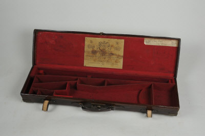 J. D. DOUGALL A BRASSBOUND LEATHER GUN CASE with compartment for 30-inch barrels, the charge card for gun no. 3695 |