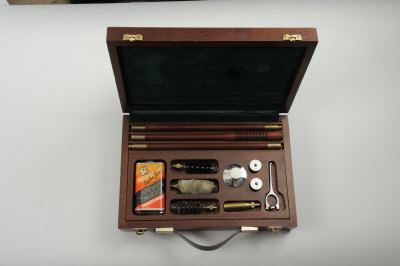 PARKER HALE A 12-BORE SHOTGUN CLEANING KIT in its mahogany case; together with a leather gun slip, cartridge bag, etc |