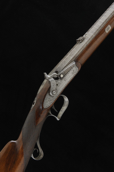 JAMES WILKINSON & SON A 20-BORE PERCUSSION SPORTING RIFLE, NO. 3046 30-inch octagonal damascus barrel with micro-groove rifling, the rear sight with folding leaves, the breech with platinum plug, full length ramrod, the lock and hammer with bold scroll engraving, set trigger, removable aperture sight missing, the half length stock with engraved steel furniture and cheekpiece, 13 1/2-inch pull, 7lb. 4oz., black powder proof S58 |