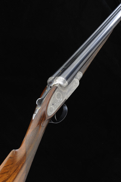 28-inch barrels with 2 1/2-inch chambers, about 1/4 and 1/2 choke borings, doll's head extension, the frame, locks and gold numbered top lever with bouquet and scroll engraving, and retaining traces of hardening colour, 14 1/4-inch figured replacement stock, 6lb. 10oz., nitro proof, bores marked, in its brassbound leather case