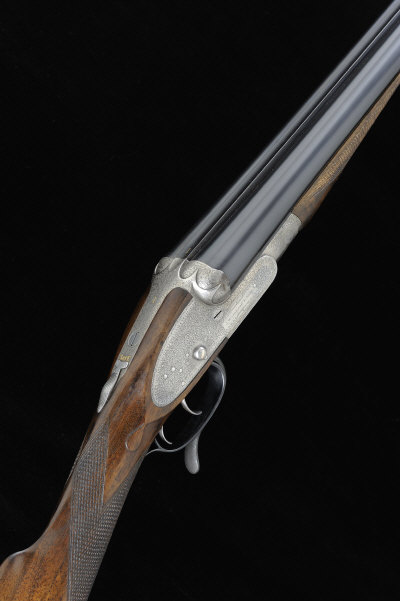 J. WOODWARD & SONS A 12-BORE "AUTOMATIC" MODEL SIDELOCK EJECTOR GUN, NO. 4394 29-inch Whitworth steel barrels with 2 1/2-inch chambers, about improved cylinder and 1/2 choke borings, the frame, locks and push-forward underlever with fine scroll engraving, arcaded clipped fences, raised gold line cocking indicators, 14 1/4-inch figured replacement stock and fore-end wood, 6lb. 6oz., nitro re-proof, in a brassbound leather case with John Dickson & Son label S2 |