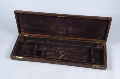 A BRASSBOUND MAHOGANY GUN CASE suitable for a hammer gun, with compartment blocked for 28-inch barrels, the lid signed "T. Fox" |